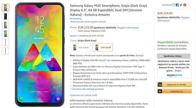 Riguardo prezzi e disponibilità, Samsung Galaxy M20 viene proposto in India dal prezzo equivalente di circa 135 euro in versione 3GB+32GB, mentre il costo ufficiale in Italia è di 229 euro su Amazon.it, dove si trova dall’11 marzo 2019 disponibile in versione 4GB+64GB nelle varianti di colore Grigio (Dark Gray) e Blu (Blue) con supporto DualSIM. Il Samsung Galaxy M20 è inoltre disponibile sul Samsung Shop Online.