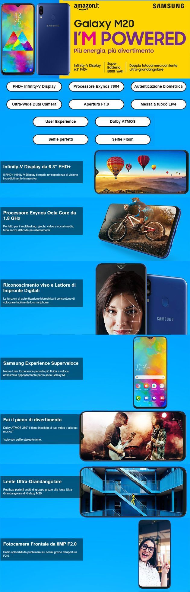 Il Samsung Galaxy M20 in un corpo che misura 156.4×74.5×8.8mm e che pesa 186 grammi ospita un display LCD Infinity-V di diagonale 6,3 pollici con risoluzione FHD+ e notch a goccia al centro in alto, con rapporto di aspetto 19.5:9 e rapporto schermo-a-corpo maggiore del 90%. Galaxy M20 ha una fotocamera posteriore doppia, con un sensore da 13MP F1.9 abbinato ad un sensore da 5MP con Ultra-Wide-Angle di 120 gradi; frontalmente, all’interno di una notch a goccia, ha un sensore da 8MP F2.0. Ad alimentare il Galaxy M20 di Samsung ci pensano una batteria da 5000mAh con supporto per la ricarica rapida via USB Type-C (10 minuti di ricarica per 3 ore di video o 11 ore di musica con il caricatore da 15W in dotazione) e un chipset octa-core Samsung Exynos 7904 a 1.8GHz (dual-core ARM Cortex A73 1.8GHz + hexa-core Cortex A53 a 1.6GHz, GPU Mali-G71 MP2, processo costruittivo 14nm). Le memorie ammontano a 4GB la RAM mentre lo storage è di 64GB espandibile con microSD fino ad ulteriori 512GB (in India disponibile anche in configurazione 3GB+32GB). Il sistema operativo è Android 8.x Oreo con interfaccia utente Samsung Experience v9.5. Il telefono offre lo sblocco tramite riconoscimento facciale (Fast Face Unlock) e ha un lettore di impronte digitali. Galaxy M20 inoltre supporta l’audio Dolby Atmos.