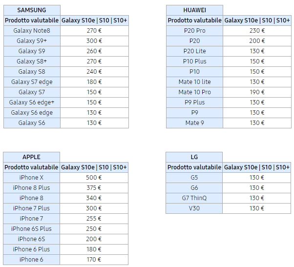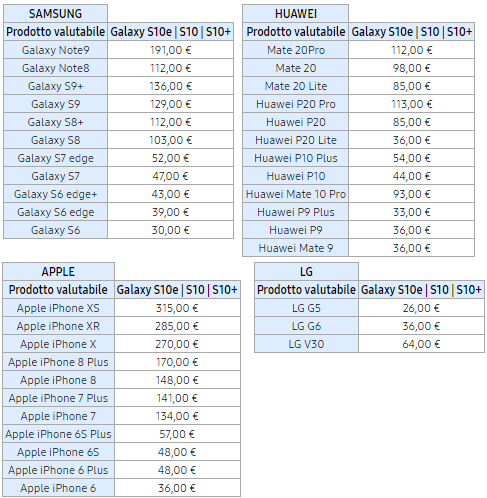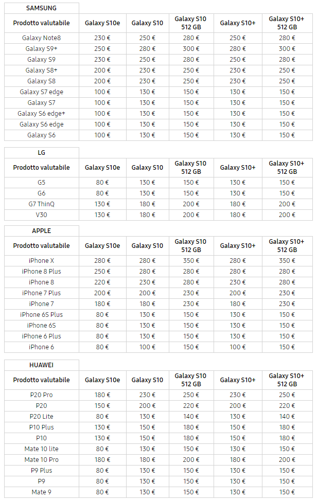 Gli smartphone valutabili sono: Samsung Galaxy Note9, Galaxy Note8, Galaxy S9+, Galaxy S9, Galaxy S8+, Galaxy S8, Galaxy S7 edge, Galaxy S7, Galaxy S6 edge+, Galaxy S6 edge, Galaxy S6; LG G5, G6, V30; Apple iPhone XS, iPhone XR, iPhone X, iPhone 8 Plus, iPhone 8, iPhone 7 Plus, iPhone 7, iPhone 6S Plus, iPhone 6S, iPhone 6 Plus, iPhone 6; Huawei Mate20 Pro, Mate20, Mate20 Lite, P20 Pro, P20, P20 Lite, P10 Plus, P10, Mate 10 Pro, P9 Plus, P9, Mate 9. La tabella dei modelli valutabili e relativo valore è disponibile qui sotto.