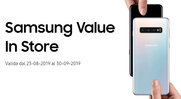 E’ stata riattivata tra il 23 agosto 2019 e il 30 settembre 2019 inclusi l’iniziativa Samsung Value In Store attraverso la quale è possibile portare in negozio il vecchio smartphone, tra quelli che rientrano in questo programma di valutazione, farselo valutare e, in caso di valutazione positiva, ricevere fino a 315 euro sull’acquisto di un nuovo Galaxy S10e, S10 o S10+. L’iniziativa era stata proposta già nei mesi di Luglio, Maggio e Giugno 2019 con valutazione fino a 500 euro e tra l’8 marzo e il 30 aprile 2019 con valutazione fino a 350 euro.