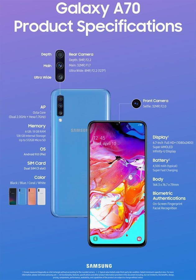 "I consumatori di oggi utilizzano i loro telefoni in modo visivamente più attivo e autentico, condividendo le loro esperienze e rimanendo connessi più a lungo", ha dichiarato DJ Koh, Presidente e CEO della IT & Mobile Communications Division di Samsung Electronics. "Queste connessioni possono prosperare solo quando le funzionalità più essenziali consentono alle persone di migliorare le interazioni attraverso una connessione spontanea, collaborativa e autentica. Ciò richiede un’evoluzione. Ecco perché, per soddisfare le esigenze di questa generazione emergente, abbiamo creato il nuovo Galaxy A70, progettato per il modo in cui le persone si stanno connettendo ora. "
