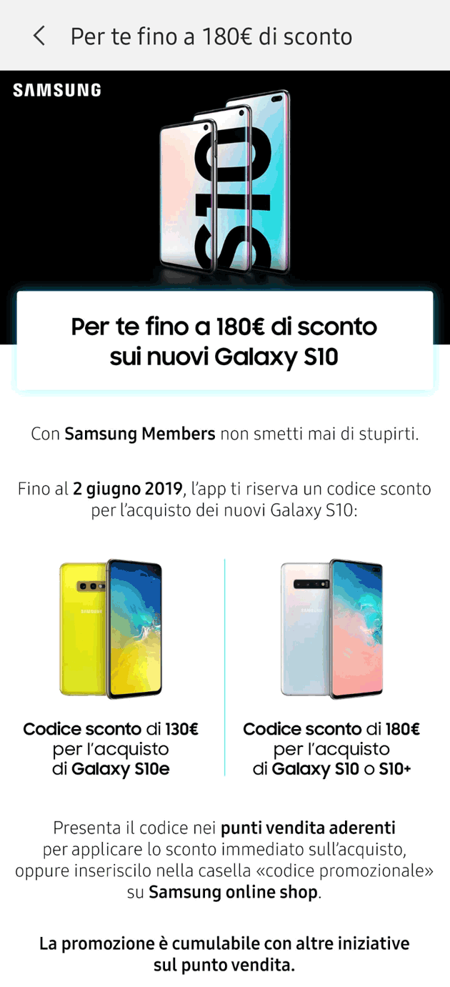 Se hai uno smartphone Samsung accedi alla app Samsung Members e ottieni un buono sconto di fino a 180 euro da utilizzare, entro il 2 giugno, per l'acquisto di Galaxy S10e, S10 o S10 Plus.