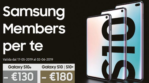 Nell’ambito della iniziativa "Samsung Members per te – Maggio 2019" vengono messi a disposizione dei partecipanti dei codici univoci che daranno diritto ad ottenere uno sconto sul prezzo di vendita, applicato dai rivenditori aderenti all’iniziativa e sul Samsung Online Shop (https://shop.samsung.com/it/), ai seguenti smartphone a marchio Samsung della Gamma S10: Samsung Galaxy S10e (codice modello SM-G970F); Samsung Galaxy S10 (codice modello SM-G973F); Samsung Galaxy S10+ (codice modello SM-G975F).