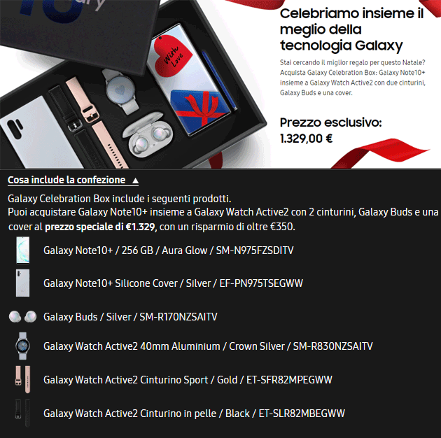 Piu’ volte quest’anno abbiamo ricordato che la famiglia Galaxy di dispositivi Samsung festeggia 10 anni. Per l’occasione, diverse iniziative sono state tenute dalla società sudcoreana nei vari paesi dove vende i suoi prodotti. In Italia, poche settimane fa, Samsung ha proposto prodotti scontati fino al 50 per cento nel suo shop online. In vista delle festività natalizie, Samsung Electronics ha annunciato la disponibilità limitata in alcuni mercati, a partire dal mese di novembre, del pacchetto "Samsung Galaxy 10th Anniversary Premium" comprensivo di uno smartwatch Galaxy Watch Active2 con tanto di due cinturini di riserva, uno smartphone Galaxy Note10+ con tanto di Silicon Cover e auricolari full wireless Galaxy Buds. Il 20 novembre, Samsung Italia ha annunciato la disponibilità di questo pack, col nome ‘Samsung Galaxy Celebration Box’, al prezzo di 1.329 euro, con un risparmio di oltre 350 euro rispetto al valore totale dei singoli prodotti inclusi.