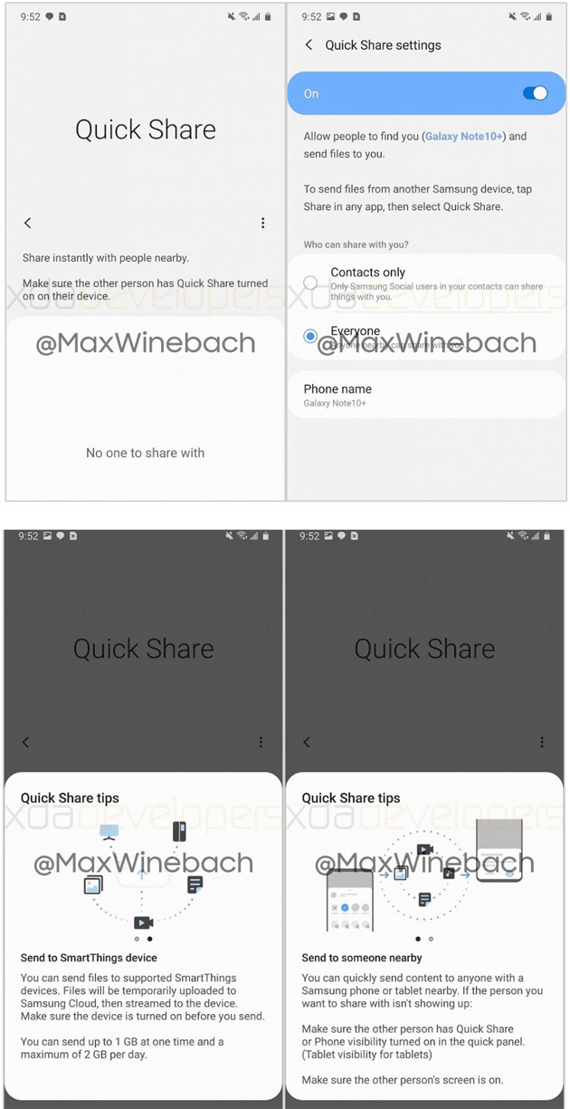A rivelare la nuova funzione è stato il sito XDA-Developers tramite @MaxWineback, che ha riferito di avere tra le mani una unità di prova del Galaxy S20+ 5G con ‘Quick Share’ disponibile.