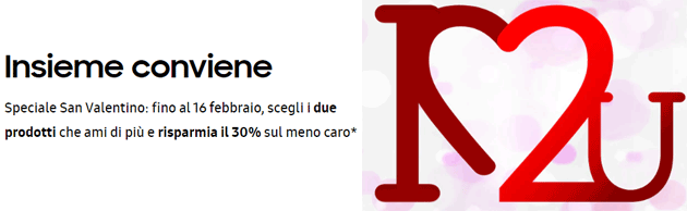 La promozione "Speciale San Valentino" è valida dal 07/02/2020 fino al 16/02/2020 solo sui prodotti che si trovano nella pagina shop.samsung.com/it/insiemeconviene e solo in caso di acquisto contestuale di due prodotti comporta l’applicazione di uno sconto immediato a carrello del 30% sul prezzo del prodotto meno caro.