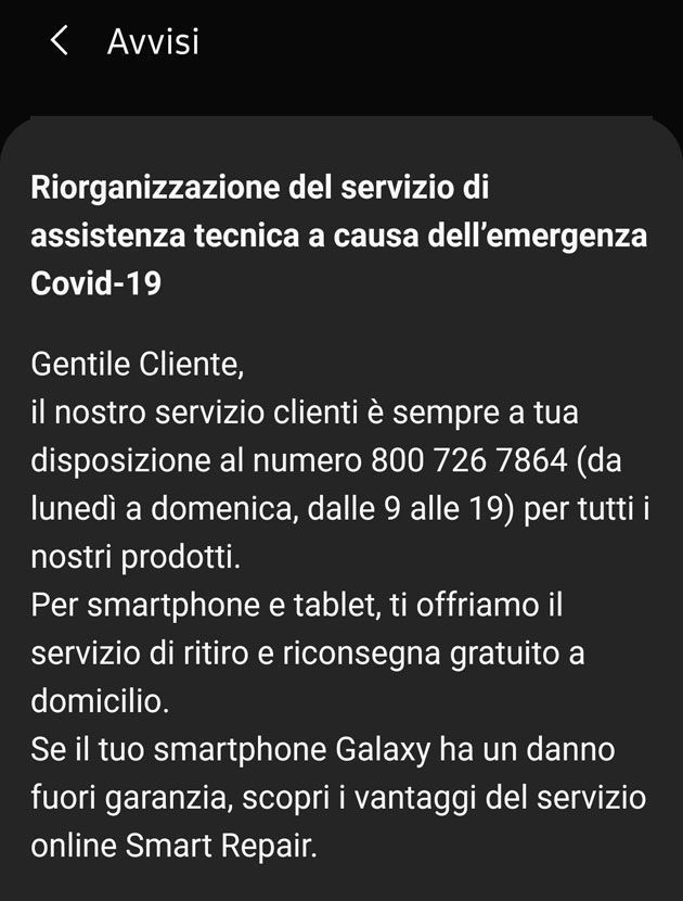 La comunicazione di Samsung sulla riorganizzazione del servizio di assistenza tecnica a causa dell’emergenza COVID-19