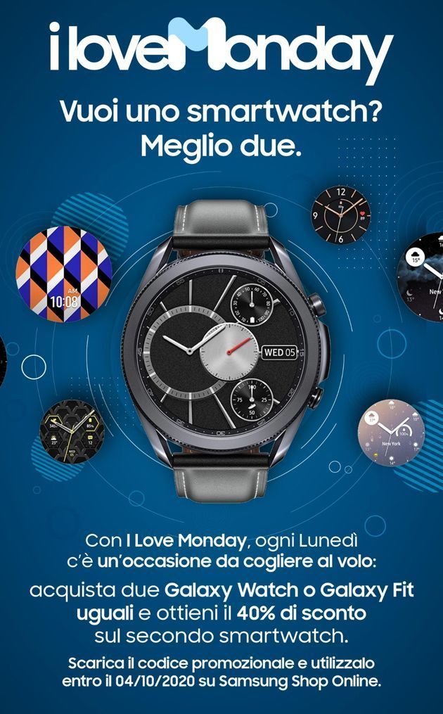 Nella giornata di lunedi 21 settembre 2020, l’iniziativa I Love Monday di Samsung, che premia ogni lunedi i clienti Samsung che utilizzano l’applicazione Samsung Members, propone uno sconto pari al 40% sul prezzo di vendita del prodotto meno caro (o sul secondo prodotto dello stesso modello), in caso di acquisto congiunto su Samsung Online Shop di due prodotti a marchio Samsung tra Galaxy Fit, Galaxy FitE, Galaxy Watch Active, Galaxy Watch Active2, Galaxy Watch, Galaxy Watch3.
