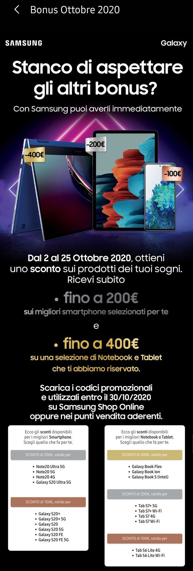 In occasione del lancio in Italia del suo nuovo smartphone Galaxy S20 FE, Samsung ha lanciato una promozione che coinvolge gli attuali dispositivi top di gamma della serie Galaxy, tra smartphone, tablet e notebook. In particolare, dal 2 al 25 ottobre 2020, sul sito samsung.com o tramite l’app Samsung Members è possibile ottenere un buono sconto fino a 400 euro sull’acquisto di selezionati prodotti Galaxy. Il bonus è riscattabile entro il 30 ottobre 2020, semplicemente inserendo il codice alfanumerico prima di concludere l’acquisto sullo shop online di samsung.com, o presentando il codice a barre in formato cartaceo o direttamente dallo schermo del proprio device negli store fisici dove è previsto lo sconto immediato in cassa.