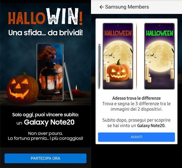 Per partecipare al concorso a premi "Halloween, puoi vincere con Samsung" e provare a vincere un Samsung Galaxy Note20 bisogna aprire l’app Samsung Members, quindi premere il banner "HalloWIN, una sfida da brividi" – come si può vedere negli screenshot qui allegati. E’ quindi possibile premere sul pulsante “Partecipa Ora” e partecipare al gioco proposto, consistente in un “trova le differenze”. Indipendentemente dall’individuazione di uno o più differenze, al termine del gioco si attiva il meccanismo di estrazione instant win (si hanno le medesime probabilità di vincita a prescindere dal numero di differenze trovate durante il gioco) e viene rivelato immediatamente l’esito dell’estrazione. In caso di vincita viene visualizzato un messaggio a schermo attestante l’avvenuta vincita con le indicazioni per accettare o rifiutare il premio vinto (un Samsung Galaxy Note20).