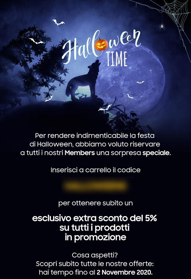 In occasione della festa di Halloween 2020, Samsung ha riservato a tutti i proprietari di un dispositivo Galaxy un extra sconto del 5 per cento su tutti i prodotti in promozione nel Samsung Shop Online. Questo sconto è disponibile tramite il codice promozionale che ogni utente Samsung può richiedere all’interno dell’app Samsung Members, all’interno della sezione ‘Halloween Time’. Il codice è utilizzabile direttamente a carrello fino al 2 novembre 2020.