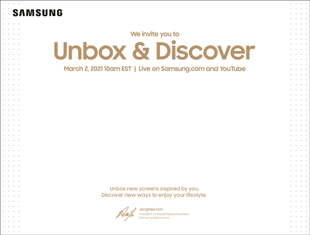 "Dopo un anno senza precedenti, che ha visto le abitudini dei consumatori cambiare in modo esponenziale, anche nei ritmi e abitudini davanti alla TV, Samsung Electronics porta avanti la sua missione di fornire prodotti innovativi per ogni consumatore, per tutto il 2021." si legge nell’invito. "Il 2 marzo, Samsung condividerà la sua visione su come ridefinire il ruolo della TV, attraverso tecnologie all’avanguardia, design attraente e partnership di grande impatto."