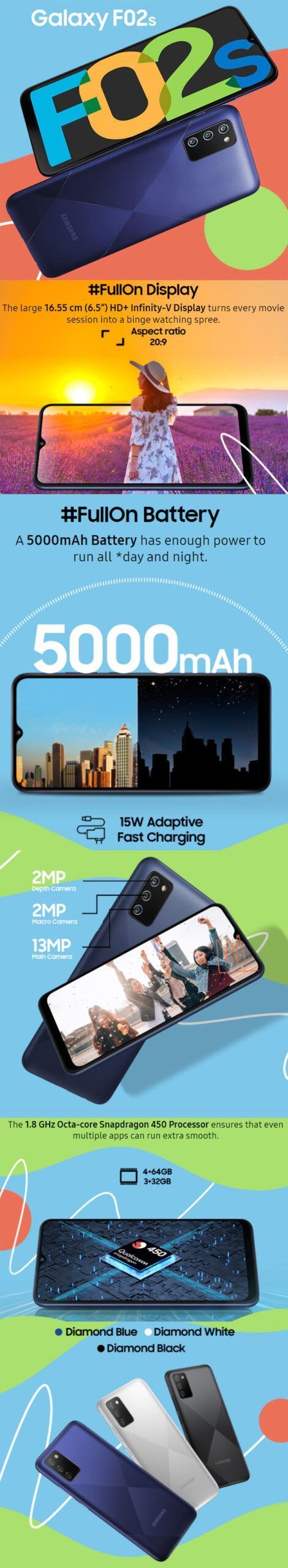 Galaxy F02s propone sul retro una Tripla-Camera con obiettivo principale da 13MP affiancato da un sensore di profondità da 2MP e da un sensore da 2MP per macro. Nella parte frontale si trova un obiettivo da 5MP ospitato in una notch a goccia che invade il display da 6.5 pollici HD+ con rapporto di aspetto 20:9. E’ anche supportato l’audio Dolby Atmos.