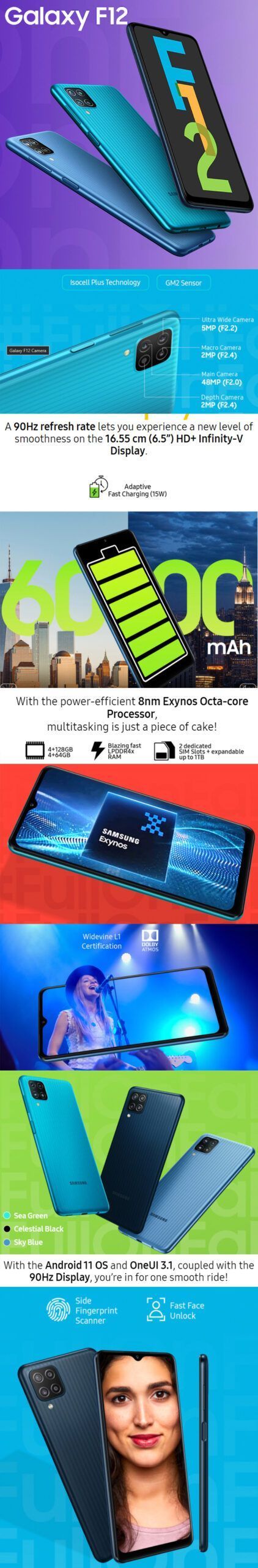 Galaxy F12 vanta fotocamera quadrupla a 48MP con tecnologia ISOCELL plus, un display a 90Hz fluido e batteria da 6000mAh, Galaxy F02s un display Infinity-V HDplus da 6,5 pollici e batteria da 5000mAh.