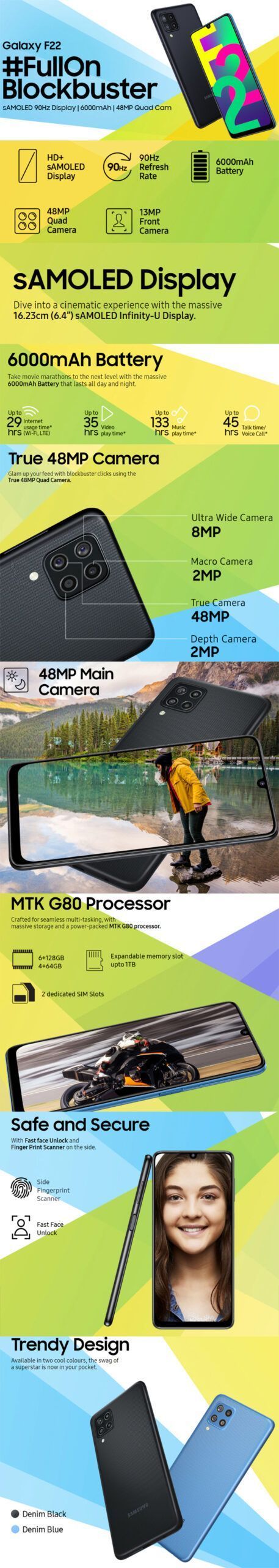 “Galaxy F22 è stato progettato per la nostra giovane generazione Z e i consumatori millenari in India che desiderano uno smartphone tuttofare in grado di stare al passo con il loro stile di vita sempre attivo. Galaxy F Series è una delle serie di smartphone più popolari su Flipkart. Con il Galaxy F22 #FullOnBlockbuster, stiamo rafforzando ulteriormente la gamma Galaxy F e portando la nostra eredità ‘Full On’ a livelli più alti. Galaxy F22 è dotato di specifiche leader del segmento: uno straordinario display sAMOLED HD+ da 6,4" con una frequenza di aggiornamento di 90Hz, un’enorme batteria da 6000mAh e una Quad-Camera da 48 MP", ha affermato Aditya Babbar, Senior Director e Head del Mobile Marketing di Samsung India.