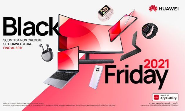 Per Black Friday 2021, Huawei propone nelle giornate del 25-26 novembre promozioni con fino al 50% di sconto su una selezione di suoi prodotti acquistabili da Huawei Store Online (consumer.huawei.com/it/offer/). Inoltre, fino al 30 novembre, quindi inclusa la giornata del Cyber Monday, sono disponibili sconti per acquistare pc, smartphone, monitor, device audio e wearable.