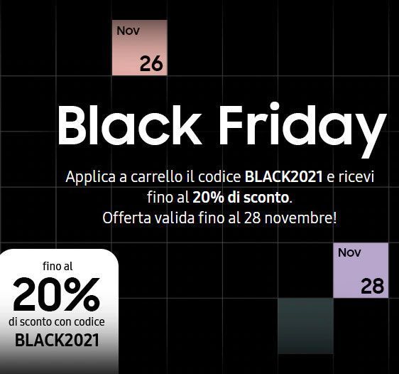 Dal 26 al 28 novembre 2021, Samsung il Samsung Shop Online propone uno sconto di fino il 20% che si può ottenere a carrello inserendo il codice promozionale BLACK2021. Il 29 novembre 2021, Samsung il Samsung Shop Online propone uno sconto di fino il 20% che si può ottenere a carrello inserendo il codice promozionale CYBER2021.