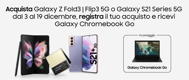 Operazione a premio riservata ai consumatori che acquistano uno smartphone a marchio Samsung Galaxy Z Flip3 5G (codice modello SM-F711B), Galaxy Z Fold3 5G (codice modello SM-F926B), Galaxy S21 Ultra 5G (codice modello SM-G998B), Galaxy S21+ 5G (codice modello SM-G996B), Galaxy S21 5G (codice modello SM- SM-G991B). Periodo di acquisto: dall’03 dicembre 2021 al 19 dicembre 2021 inclusi. Registrazione dell’acquisto entro il 09 gennaio 2022 su members.samsung.it/promozioni/xmasgalaxy. Punti vendita aderenti: punti vendita in Italia che espongono il materiale promo pubblicitario relativo all’Operazione e gli E-Store elencati nell’Allegato A del Regolamento. Premio: Samsung Galaxy Chromebook Go (14") (codice prodotto: XE340XDA-KA1IT). Il Premio verrà consegnato gratuitamente, entro 180 giorni dalla data di spedizione dell’e-mail di validazione, presso l’indirizzo indicato al momento della registrazione dell’acquisto.