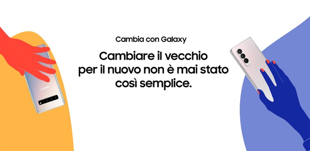 Iniziativa promozionale valida solo per consumatori residenti nella UE acquistano tra il 06 dicembre 2021 e il 03 gennaio 2022 inclusi un Samsung Galaxy Z Fold3 5G (SM-F926B), Z Flip3 5G (SM-F711B), S21 Ultra 5G (SM-G998B), S21+ 5G (SM-G996B) o un S21 5G (SM-G991B), oppure tra il 06 dicembre 2021 e il 24 dicembre 2021 inclusi un Samsung Galaxy Buds Pro (SM-R190N), Buds Live (SM-R180N), Buds2 (SM-R177N), Watch4 44 mm (SM-R870N), Watch4 44 mm LTE (SM-R875F), Watch4 40 mm (SM-R860N), Watch4 40 mm LTE (SM-R865F), Watch4 Classic 46mm (SM-R890N), Watch4 Classic 46mm LTE (SM-R895F), Watch4 Classic 42mm (SM-R880N) o un Watch4 Classic 42mm LTE (SM-R885F) presso i punti vendita aderenti oppure presso gli e-store indicati nell’allegato A dei Termini e Condizioni dell’iniziativa. La registrazione del prodotto acquistato va effettuata su members.samsung.it/galaxytradein: entro il 24 gennaio 2022 nel caso di smartphone, entro il 14 gennaio 2022 nel caso di wearable. Il valore della valutazione sarà riconosciuto, a seconda delle condizioni dell’usato, tramite bonifico bancario entro 45 giorni dal ritiro dell’usato, su conti correnti dell’Unione Europea intestati al partecipante dell’iniziativa, raggiungibili e validi sino al 31 luglio 2022, a condizione che l’usato presenti tutti i requisiti di idoneità per l’iniziativa. Il codice IBAN, una volta comunicato, non è modificabile. L’usato deve essere di proprieta’ esclusiva dell’utente finale. Non sono ammessi usati, ad esempio, noleggiati o concessi in leasing all’utente finale. Tra gli smartphone, tablet, notebook, pc, smartwatch e auricolari wireless valutabili ci sono quelli a brand Samsung ma anche Apple, Huawei, Lg, Xiaomi, Fitbit, Fossil, Motorola, OnePlus, Windows, Garmin, Honor.