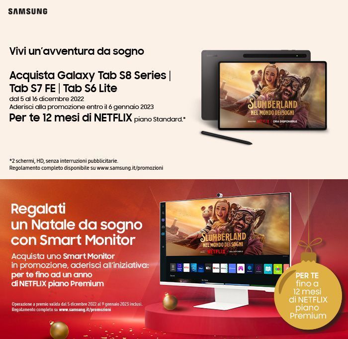Acquistando tra il 5 dicembre 2022 e il 16 dicembre 2022 inclusi un tablet Samsung Galaxy Tab S8 Ultra Wifi (SM-X900N), Galaxy Tab S8 Ultra 5G (SM-X906B), Galaxy Tab S8+ Wifi (SM-X800N), Galaxy Tab S8+ 5G (SM-X806B), Galaxy Tab S8 Wifi (SM-X699N), Galaxy Tab S8 5G (SM-X706B), Galaxy Tab S7 FE 5G (SM-T736B), Galaxy Tab S7 FE Wifi (SM-T733N), Galaxy Tab S6 Lite LTE (SM-P619N, SM-P615N) oppure Galaxy Tab S6 Lite Wifi (SM-P613N, SM-P610N) si avrà diritto ad un voucher Netflix del valore di 155,88 euro.