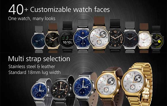 Huawei Watch è stato progettato con band da 18 millimetri per uomini e donne, che sono intercambiabili e Huawei offrirà sia fasce di metallo che di pelle. Le opzioni di colore sono: Gold/Brown Leather, Silver e Black. Ci sono anche un cinturino in pelle nera e un braccialetto in acciaio inox di colore Oro.