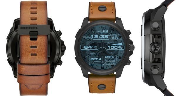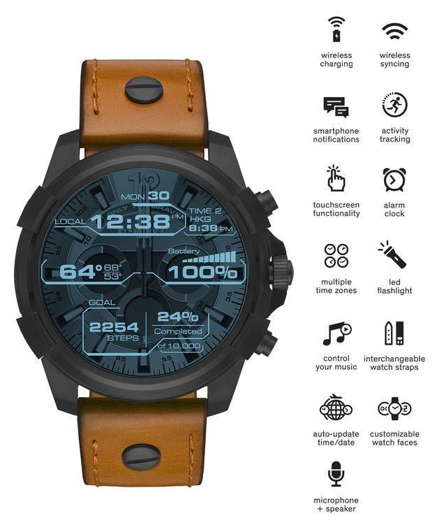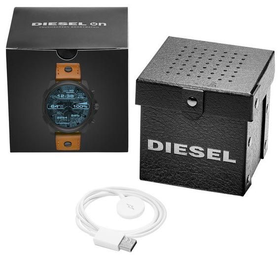 "Lo stile personalizzato incontra la praticità high-tech con lo smartwatch touchscreen Diesel Full Guard" si legge nella descrizione ufficiale di Diesel. "La cassa in acciaio IP nero si abbina al cinturino in pelle marrone e al quadrante touchscreen personalizzabile".