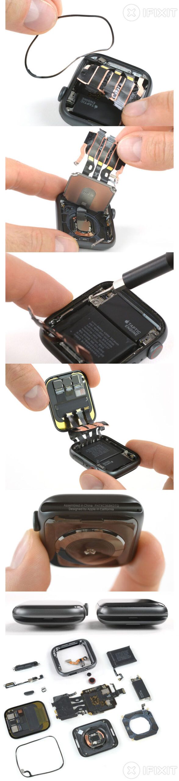 iFixit ha assegnato all’Apple Watch Series 4 un punteggio di riparabilità di 6 su 10 (con 10 che sta per ‘più facile da riparare’). Nelle sue considerazioni finali, iFixit scrive che la sostituzione dei cinturini è rapida e semplice, la sostituzione dello schermo è difficile ed è la prima cosa che si stacca poichè è attaccato tramite semplici connettori ZIF, la sostituzione della batteria è piuttosto semplice una volta riusciti ad aprire il wearable; ci sono tante viti a tre punte estremamente piccole a fare da ostacolo alla riparazione, mentre il processore S4 rivestito in resina rende impossibile la maggior parte delle riparazioni a livello di scheda.