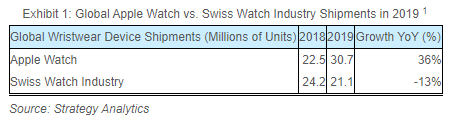 Stando alle stime della società di analisi del mercato, nel 2019 Apple ha spedito 30,7 milioni di suoi smartwatch in tutto il mondo, crescendo del 36% dai 22,5 milioni del 2018. Per confronto, 21 milioni sono stati gli orologi spediti da tutti marchi di orologi svizzeri messi insieme nello stesso periodo, in calo del 13% rispetto ai 24,2 milioni nel 2018.