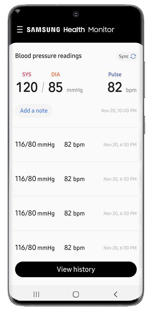 Quando si misura la pressione sanguigna con Galaxy Watch, i risultati della misurazione possono essere sincronizzati con l’app Samsung Health Monitor sul telefono Galaxy. È quindi possibile monitorare la pressione sanguigna per giorni, settimane o mesi e scegliere di condividere queste informazioni con il proprio medico per la revisione o la consultazione.