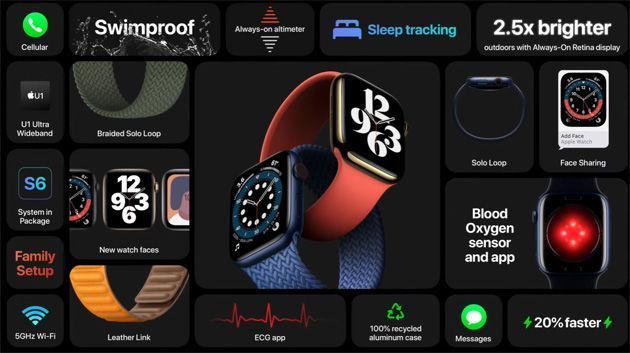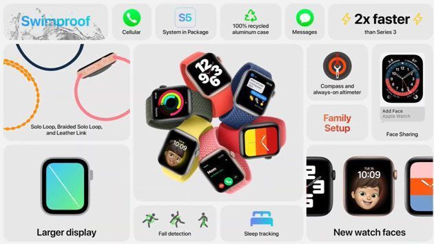 Apple Watch Series 6 mantiene molto del Watch Series 5 predecessore, con novità principale la misurazione della saturazione di ossigeno nel sangue ma offre anche diversi miglioramenti hardware, tra cui un System in Package (SiP) più veloce e un altimetro sempre attivo di nuova generazione. Il Watch SE viene considerato come un Apple Watch ‘economico’, che offre le caratteristiche principali degli orologi intelligenti di Apple tra cui display Retina, i più recenti sensori di movimento e microfono, le funzionalità di salute e sicurezza tra cui rilevamento delle cadute, SOS emergenze, chiamate di emergenza internazionali e l’app Rumore. Entrambi gli orologi eseguono fuori-dalla-scatola il nuovo sistema operativo WatchOS 7 con tutte le novità che porta con sè, tra cui monitoraggio del sonno avanzato, rilevamento automatico del lavaggio delle mani, nuovi tipi di allenamento e la possibilità di creare e condividere quadranti, incoraggiando ad essere più attivi.