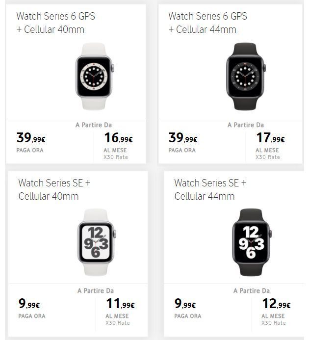 Vodafone propone Apple Watch Series SE in edizione GPS+Cellular nelle taglie da 40mm e 44mm rispettivamente a 369,99 euro e 399,99 euro, mentre Apple Watch Series 6 in edizione GPS+Cellular nelle taglie da 40mm e 44mm rispettivamente a 549,99 euro e 579,99 euro con pagamento in unica soluzione. Per tutte le versioni, i colori disponibili sono Argento o Grigio siderale, con cinturino sport Bianco o Nero.