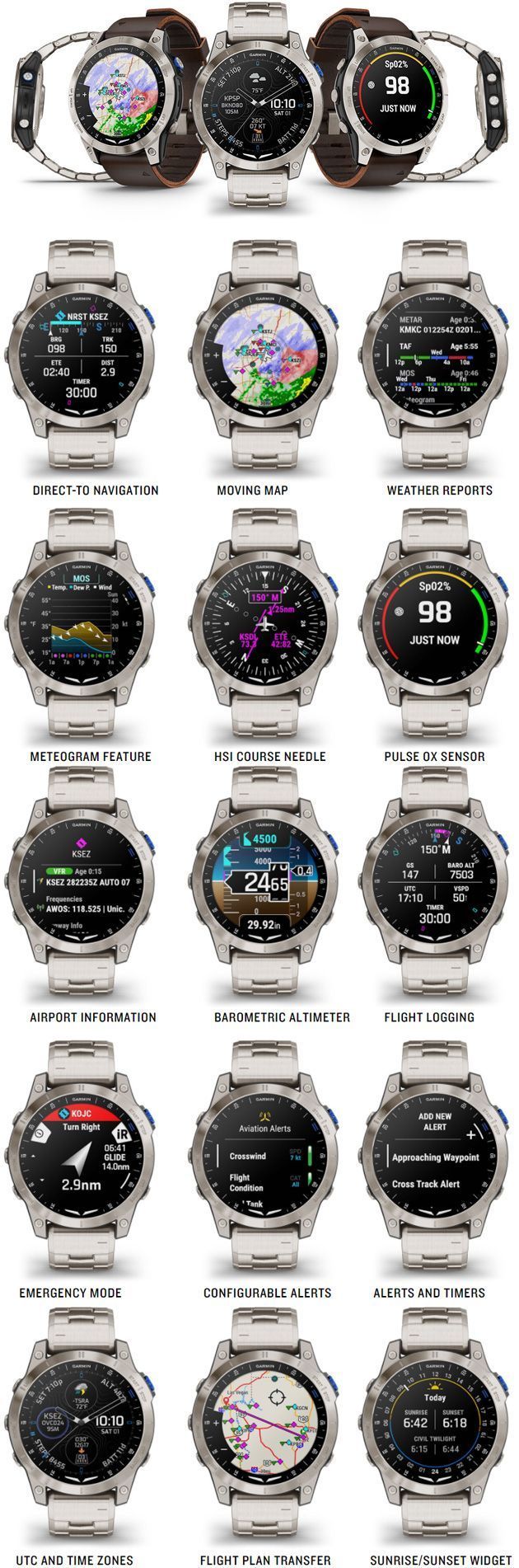 Garmin D2 Mach 1 include diverse informazioni utili per assistere al meglio piloti e aspiranti tali nella navigazione e avere sotto controllo dati importanti insieme alla frequenza multi-banda e al supporto multi-GNSS per un posizionamento GPS preciso. La navigazione Direct-to consente ai piloti di navigare direttamente verso un aeroporto e la funzione Nearest attiva una rotta diretta verso quello più vicino. Inoltre, questo wearable offre rapporti meteo agli aeronauti, tra cui METAR e TAF che permettono di avere informazioni sui venti, sulla visibilità e altro ancora (se connesso ad uno smartphone compatibile collegato ad internet) prima del decollo. Sono anche disponibili indicazioni grafiche delle previsioni per aeroporti statunitensi specifici, comprese le proiezioni per le tendenze della temperatura, il vento, il punto di rugiada e altro ancora.
