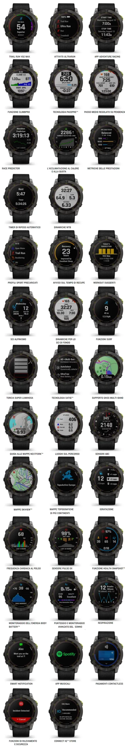 Tra le funzioni disponibili, segnaliamo: ‘Trail run VO2 max‘ che calcola il livello di allenamento cardiovascolare degli atleti di trail running, tenendo conto delle variazioni dei sentieri e delle condizioni del terreno che potrebbero influire sulle prestazioni della corsa; timer di recupero e registrazione del tempo trascorso presso i punti di ristoro; profilo attività che consente di visualizzare frequenza cardiaca, quota, tempi di segmento e altre metriche quando la gara è in corso; pianificazione ClimbPro su percorsi scaricati per visualizzare informazioni in tempo reale su ascese effettuate e residue, inclusa la pendenza, la distanza e il dislivello, ma anche su discese e percorsi in pianura; PacePro, che aiuta a mantenere il passo corretto per raggiungere il proprio obiettivo con indicazioni dinamiche basate sulla pendenza del percorso che stai seguendo; Race Predictor, che fornisce una stima del passo ideale per l’obiettivo da raggiungere, con i dati di trend che mostrano l’impatto dell’allenamento nel tempo; metriche avanzate sull’allenamento che includono dinamiche di corsa, VO2 max calcolate in base a temperatura e quota, ottimizzazione Trail Running, avviso di recupero e altro. Quando associato ad uno smartphone compatibile, il wearable è in grado anche di dire come il proprio corpo reagisce in ambienti diversi con l’acclimatazione al calore e alla quota.