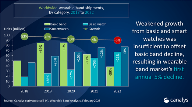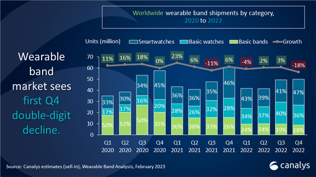 La società  di analisi di mercato Canalys ha stimato 50 milioni di wearable spediti nel quarto trimestre del 2022, in calo del 18% rispetto allo stesso periodo dell'anno precedente. Guardando all'intero anno 2022, spedizioni diminuite del 5% a 182,8 milioni di unità  rispetto a 193 milioni di unità  nel 2021. Apple unico brand con crescita di spedizioni nel 2022 rispetto al 2021.