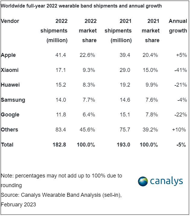 Complessivamente, Canalys ha stimato 182,8 milioni di wearable spediti nel 2022 rispetto a 193 milioni di unità nel 2021 (-5%).