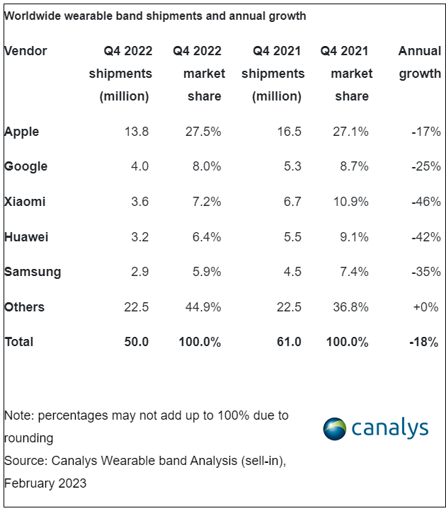 Andando ad analizzare il mercato per brand, Canalys mette Apple al primo posto della classifica per numero di spedizioni di wearable nel quarto trimestre del 2022. L’azienda di Cupertino guida la classifica con un calo del 17% di unità spedite nel Q4 2022 rispetto allo stesso periodo del 2021, con spedizioni che si attestano su 13,8 milioni di unità, con quota di mercato del 27,5% (vs 16,5 milioni di unità spedite e quota del 27,1% nel Q4 2021). Segue in seconda posizione della classifica Google, riuscita a spedire nel Q4 2022 4 milioni di wearable, in calo del 25% rispetto allo stesso periodo dell’anno precedente, con quota di mercato dell’8% (5,3 milioni di unità spedite e quota dell’8,7% nel Q4 2021). Da notare che Google non spedisce solo Pixel Watch di sua produzione ma anche i wearable di Fitbit, brand che l’azienda di Mountain View ha comprato nel 2020. Proseguendo nella classifica, al terzo posto si trova Xiaomi con 3,6 milioni di unità spedite e quota di mercato del 7,2%, con spedizioni calate del 46% rispetto allo stesso periodo dell’anno precedente (6,7 milioni di unità e quota del 10,9%). Quarta posizione per Huawei con 3,2 milioni di unità spedite e quota del 6,4%, con spedizioni calate del 42% in un anno (5,5 milioni di spedizioni e quota al 9,1% nel Q4 2021). Quinta posizione per Samsung, con 2,9 milioni di unità spedite, in calo del 35% in un anno,  e quota del 5,9% (vs 4,5 milioni di spedizioni e quota al 7,4% nel Q4 2021).