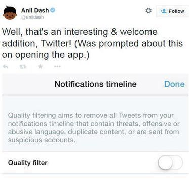 Rivelata in un tweet pubblicato dal blogger Anil Dash, la caratteristica nota come "Quality Filter / filtraggio della qualità" ha lo scopo di "rimuovere tutti i Tweets dalla timeline che contengono minacce, linguaggio offensivo o abusivo, contenuti duplicati, o vengono inviati da sospetti profili". La funzione appare come opzione sulla schermata Notifiche dell’app iOS, in cui è possibile decidere di attivare o disattivare il filtro.