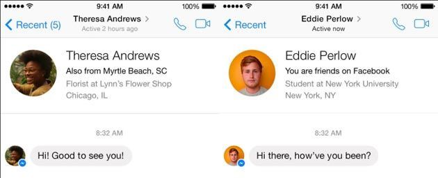 Ad esempio, se hai ricevuto un messaggio da parte di qualcuno di cui non sei amico, Messenger sarà in grado di mostrare che il contatto è una "donna", lavora come "Food Blogger" e vive a "Seattle". Queste informazioni potrebbero rinfrescare la memoria, per ricordare che magari è la persona che hai incontrato al mercato del pesce pochi giorni prima. Sapere, o avere una minima idea, di chi si tratta, potrebbe renderti più propenso a rispondere, e avviare una conversazione naturalmente, piuttosto che aprirne una chiedendo "oh… ehi… come ci siamo conosciuti? Chi sei che non mi ricordo?".