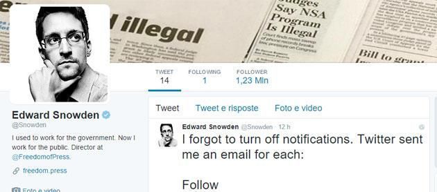 Mentre al momento segue solo l’account @NSAGov, Snowden lo scorso Giovedì ha fatto una confessione: ha ammesso di aver fatto un passo falso su Twitter. "Ho dimenticato di disattivare le notifiche", ha scritto su Twitter. "Twitter mi ha inviato una e-mail per ciascun Follow, Favorite, Retweet, DM" rivelando di avere ricevuto 47GB di notifiche e aggiungendo l’hashtag #lessonlearned.