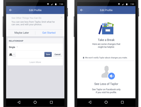 "Facebook è un luogo per condividere momenti importanti della vita, che per molte persone comprendono le loro relazioni sentimentali", ha dichiarato il product manager di Facebook Kelly Winters in un comunicato. "Quando una relazione finisce, abbiamo ricevuto feedback da persone che a volte chiedono se ci sono delle opzioni disponibili per loro su Facebook."