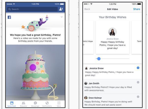 Nel giorno del compleanno non si vedrà nulla di nuovo, nel senso che il festeggiato vedrà nella bacheca del suo profilo gli auguri dagli amici o i messaggi in cui viene taggato, come sempre, metre un video della durata di 45 secondi apparirà come una storia nel News Feed il giorno dopo il compleanno dell’utente, che inizia mostrando una speciale torta di compleanno che si apre per rivelare i saluti degli amici di Facebook.