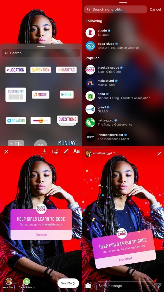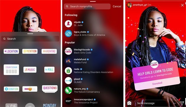 A partire dal 30 aprile 2019 negli Stati Uniti, gli utenti di Instagram possono raccogliere fondi per una non profit a cui tengono direttamente tramite una Storia. Gli utenti possono utilizzare l’adesivo per le donazioni per creare una raccolta di fondi senza fini di lucro e mobilitare la loro comunità di follower intorno ad una causa di loro interesse.