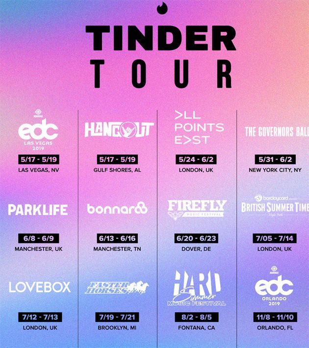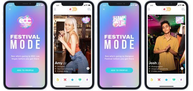 Tinder ha annunciato di avere attivato la nuova funzionalità chiamata Modalità Festival (Festival Mode) attraverso cui gli utenti possono aggiungere dei badge al proprio profilo che mostrano pubblicamente i festival musicali a cui prevedono di partecipare.