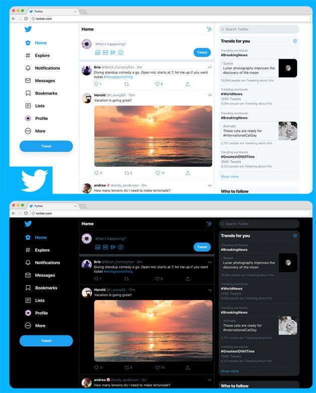 Anteprima del nuovo Twitter.com con interfaccia utente scura e chiara