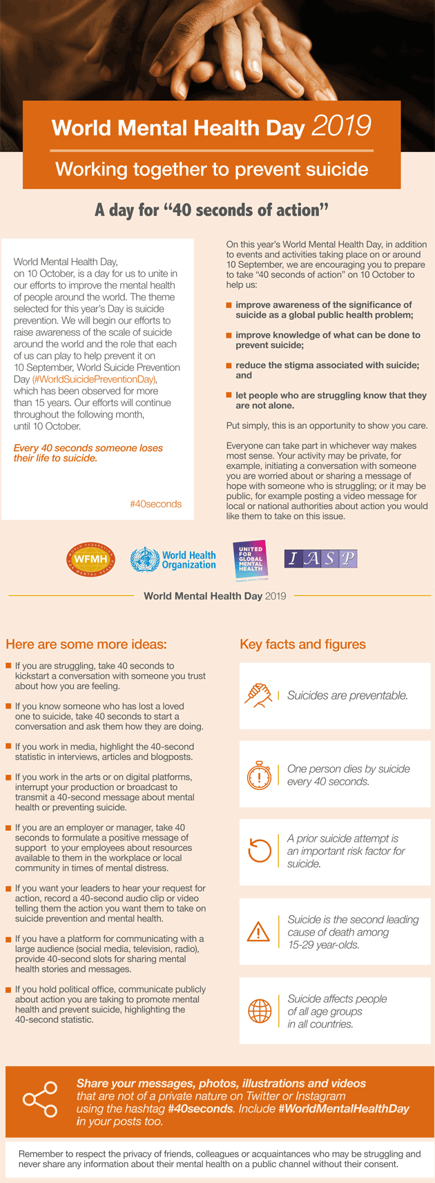 Tutti possono prendere parte all’iniziativa "40 secondi di azione", con un’attività privata – ad esempio, avviando una conversazione con qualcuno di cui si è preoccupati o condividere un messaggio di speranza con qualcuno in difficoltà – o pubblica – ad esempio, pubblicando un messaggio video rivolto alle autorità locali o nazionali sulle azioni che si vorrebbe che intraprendessero su questo problema. Tra le altre possibilità, chi lavora nei media potrebbe mettere in evidenza la statistica che ogni 40 secondi una persona muore per suicidio, o chi fa tramissioni video potrebbe dedicare 40 secondi per condividere un messaggio sulla prevenzione del suicidio. Un datore di lavoro o un manager potrebbe impiegare 40 secondi per condividere un messaggio positivo di supporto ai suoi dipendenti sulle risorse a loro disposizione sul posto di lavoro o nella comunità locale. E cosi’ via.