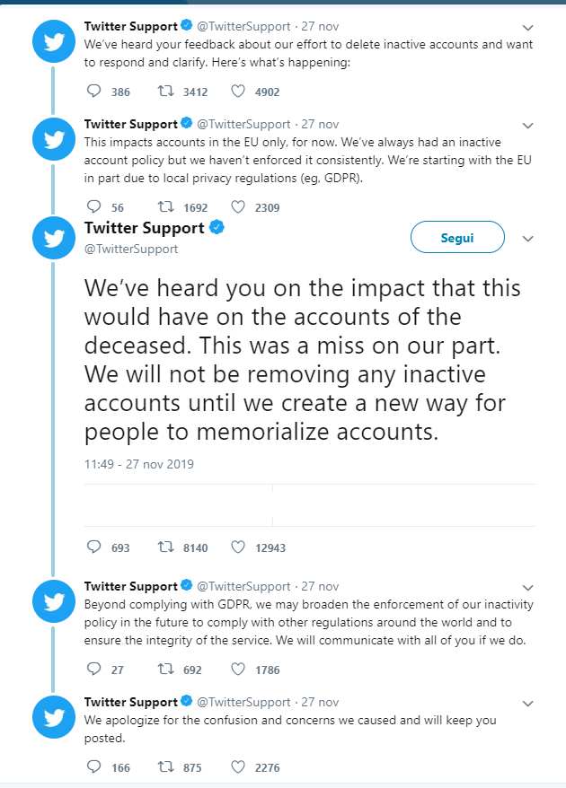 Il 27 novembre, l’account Twitter ufficiale @TwitterSupport ha fatto chiarezza su cosa prevede questa nuova politica. Abbiamo ascoltato i vostri feedback sui nostri sforzi per eliminare account inattivi e desideriamo rispondere e chiarire. Ci scusiamo per la confusione e le preoccupazioni che abbiamo causato e vi terremo informati". ha spiegato il supporto di Twitter, precisando di avere "sempre avuto una politica sugli account inattivi ma non l’abbiamo mai applicata coerentemente.Stiamo iniziando con l’UE in parte a causa delle normative locali sulla privacy (ad esempio, GDPR)", quindi il processo riguarderà solo account nell’Unione Europea, per ora."Oltre a rispettare il GDPR, in futuro potremmo ampliare l’applicazione della nostra politica di inattività per conformarci ad altre normative in tutto il mondo e garantire l’integrità del servizio. Se lo faremo, lo comunicheremo a tutti voi." In ogni caso, Twitter non inizierà ad eliminare account fino a quando non troverà un modo per evitare la chiusura di profili di persone defunte: "Ti abbiamo ascoltato sull’impatto che ciò avrebbe sugli account di chi è defunto. Questa è stata una mancanza da parte nostra. Non rimuoveremo account inattivi fino a quando non troveremo un nuovo modo per commemorare gli account di utenti defunti".