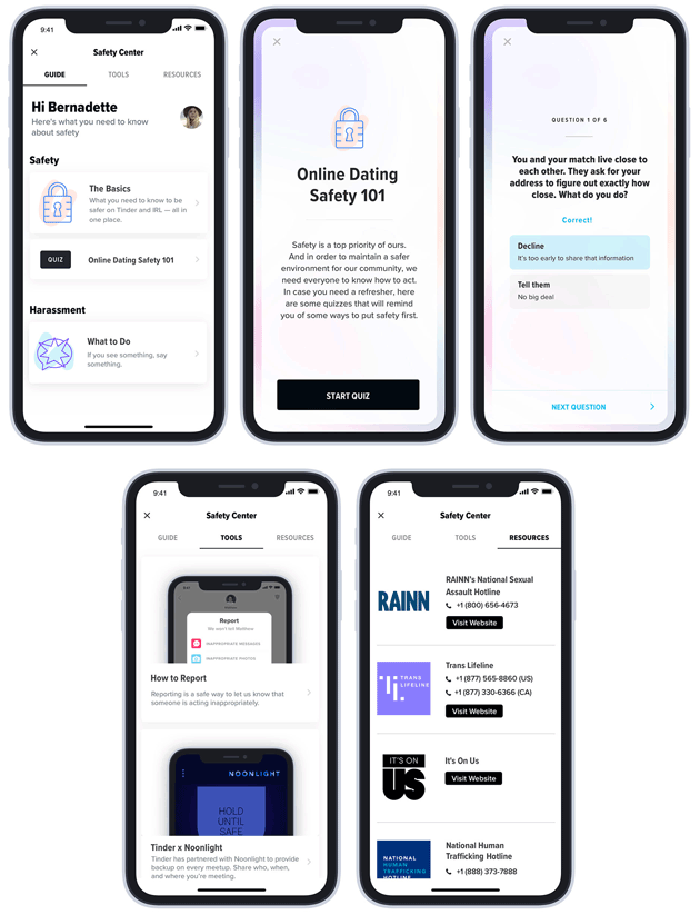 Tinder fornirà inoltre ai daters un completo Centro Sicurezza, una sezione in aggiornamento dell’app dedicata a tenere informati i membri sulle funzionalità e risorse e strumenti di sicurezza che hanno a disposizione. Disponibile a portata di mano ai membri tramite il menu principale e le chat, questo Safety Center è stato sviluppato in collaborazione con il Match Group Advisory Council e sarà presto lanciato negli Stati Uniti, nel Regno Unito, in Francia e Germania, prima di essere localizzato per altri mercati nel corso dell’anno 2020. In futuro, i contenuti del Centro sicurezza saranno personalizzati per fornire un’esperienza più pertinente per i daters.