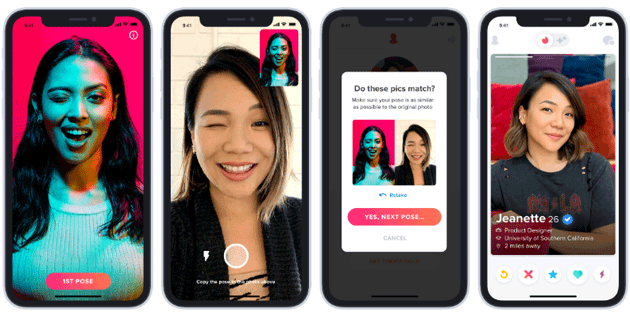 Lo strumento Verifica Foto (Photo Verification) in Tinder assicurerà che ogni match sia chi dice di essere. La funzione consente ai membri di autenticarsi automaticamente attraverso una serie di foto al proprio volto in tempo reale che vengono confrontate con le foto del profilo esistenti utilizzando la tecnologia AI assistita dall’uomo. I profili verificati mostreranno un segno di spunta blu in modo che i membri possano fidarsi della loro autenticità. La funzione viene attualmente testata in mercati selezionati e continuerà a diventare più ampiamente disponibile nel 2020.