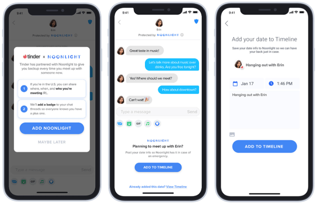 L’integrazione di Noonlight riguarderà i membri di Tinder negli Stati Uniti. L’integrazione, su richiesta, consentirà ai membri di condividere i dettagli sugli appuntamenti imminenti tramite la funzione Cronologia (Timeline) di Noonlight, come chi stanno incontrando, dove e quando, con la possibilità di attivare facilmente e in modo discreto i servizi di emergenza se si sentono a disagio o hanno bisogno di assistenza tramite l’app Noonlight.