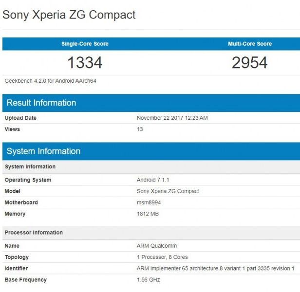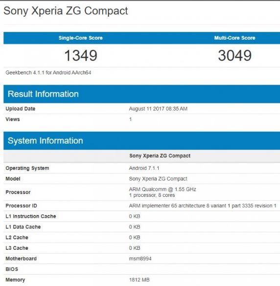 Sulla base di quanto rivelato da Geekbench, il Sony Xperia ZG Compact arriva con un processore Snapdragon 810 di Qualcomm con otto core e clock fino a 1.56GHz, Android 7.1.1 Nougat e 2GB di memoria RAM.